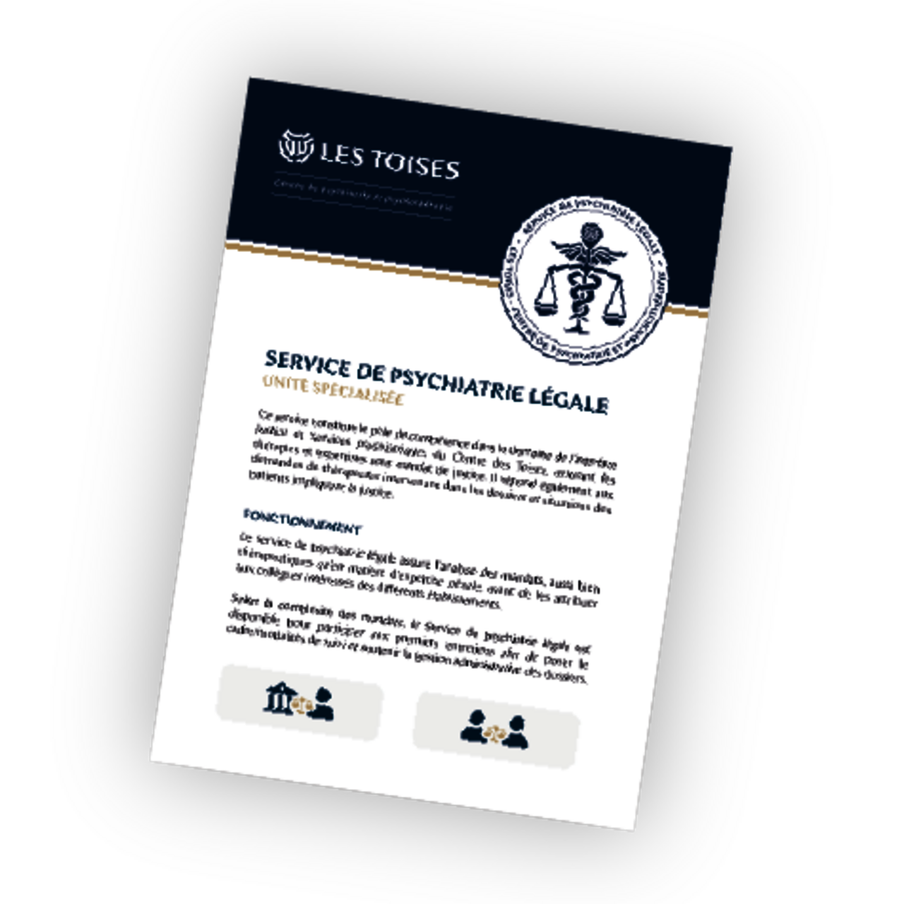 Ce service constitue le pôle de compétence dans le domaine de l’interface Justice et Services psychiatriques du Centre des Toises, assurant les thérapies et expertises sous mandat de justice pénale.